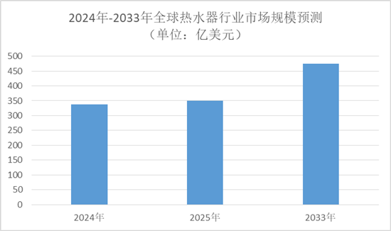中國報告大廳網訊,全球熱水器市場正處於穩步擴張與結構升級的關鍵階段,2024 年市場規模已達 337.8 億美元,2025 年預計攀升至 350.8 億美元,且將以 3.86% 的年複合增長率持續增長至 2033 年的 474.9 億美元,熱水器行業的競爭焦點已從單純的規模擴張轉向技術創新、品類分化與區域精準布局的多重博弈。