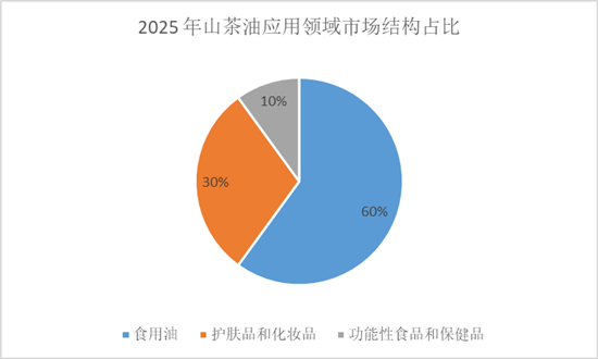 山茶油下游銷售市場集中在食品加工、護膚品和保健品三大領域,且呈多元化發展趨勢。食品加工領域,2025-2030 年年複合增長率超 15%,烘焙食品、烹飪油、調味品是增長最快的細分市場,2025 年全球烘焙食品市場規模達 150 億美元,山茶油作為烘焙原料使用量每年增長 10%,有機山茶油份額持續擴大。
