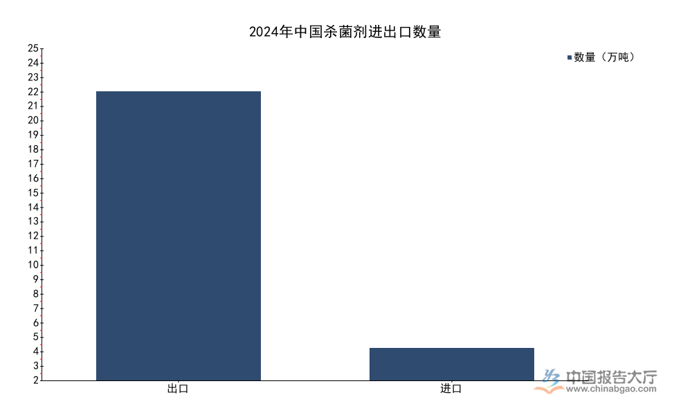 黃黴素屬於獸用抗菌類產品,歸類於殺菌劑大類下的獸用細分品類,我國整體殺菌劑進出口貿易規模,可以反映行業所處的外貿環境與產業競爭力。我國是全球最大的獸藥生產國,經過數十年的發展,已經建立起從原料藥到製劑的完整產業鏈,獸藥產品性價比優勢突出,在國際市場的份額持續提升。近年來,國內獸藥行業環保投入不斷增加,產品質量管控體系逐步完善,滿足主要出口目的地的質量標準要求,出口規模保持穩定增長。進口方面,僅少量高端特種獸藥產品進入國內市場,整體規模較小。2024年海關統計的全品類殺菌劑進出口數據,口徑統一,涵蓋所有經海關申報的進出口產品,可反映整體貿易格局。