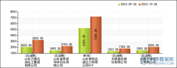 2025年10月28日,宇博智業大數據預警中心數據顯示,能源行業重點報價機構中,共有11家機構的多個品種價格較4周前(2025年09月30日)出現了上漲,平均上漲幅度為29.68%。其中,山東萬通石油化工集團有限公司的石油焦(規格:萬通石化 合格品 山東萬通石油化工有限公司)、山東省莘縣華祥石化有限公司的石油焦(規格:亞通石化 合格品 亞通石化集團有限公司)價格上漲幅度較大,今日報價分別為3250.00元/噸、2190.00元/噸,較4周前(2025年09月30日)分別上漲了60.89%、46.98%,值得投資者重點關注。