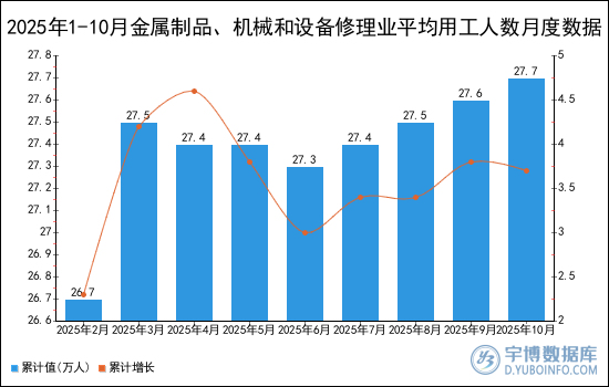 2025年1-10月金屬製品、機械和設備修理業平均用工人數統計分析